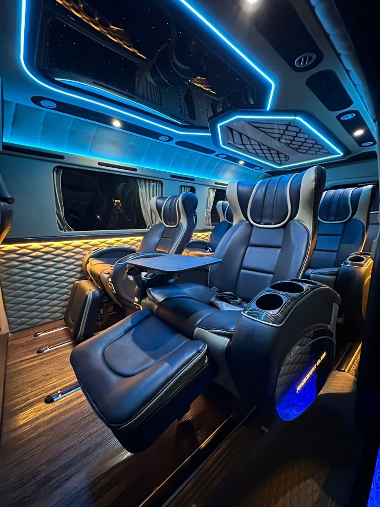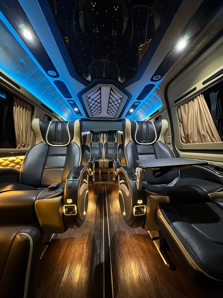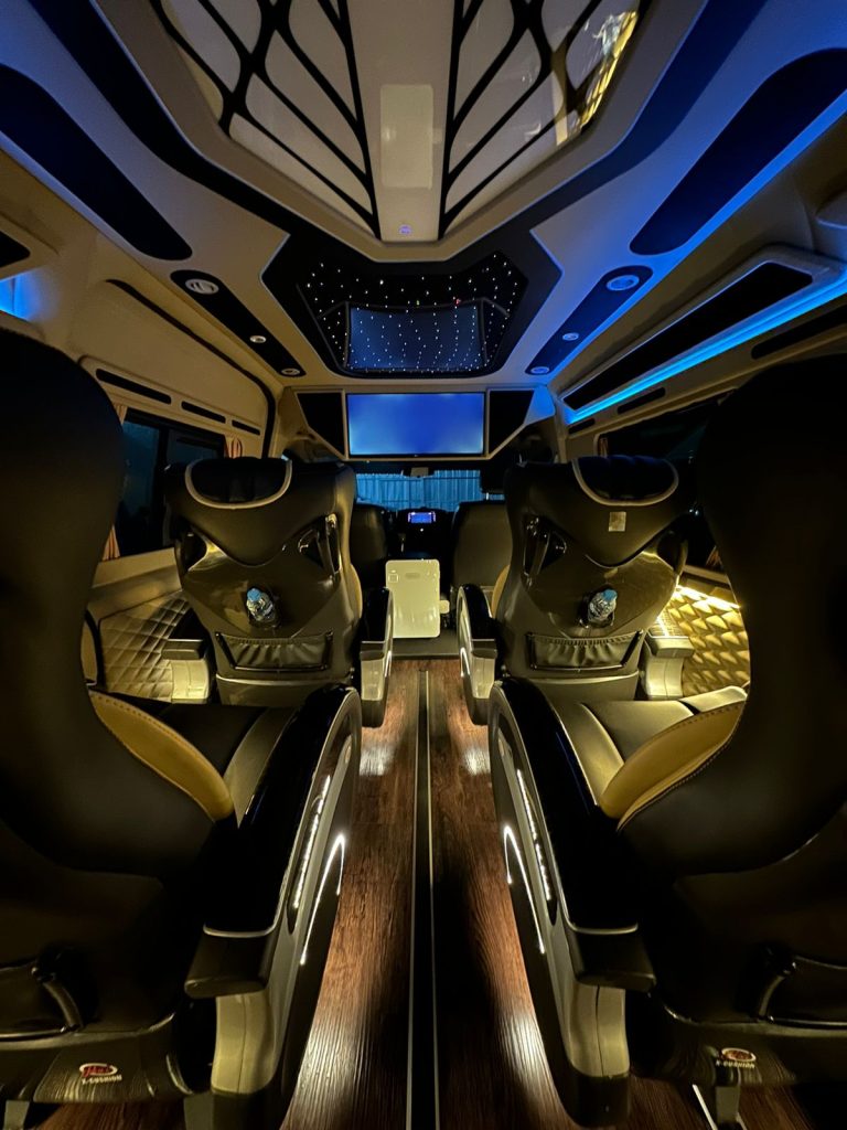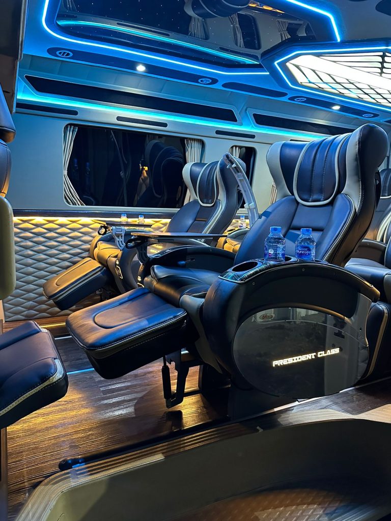 Cabin yang mewah dengan jok lebar. Untuk konfigurasi Captain seat 2-2-4 dan 1 seat sebelah driver. Dilengkapi perangkat Karaoke yg membuat perjalanan anda tidak membosankan